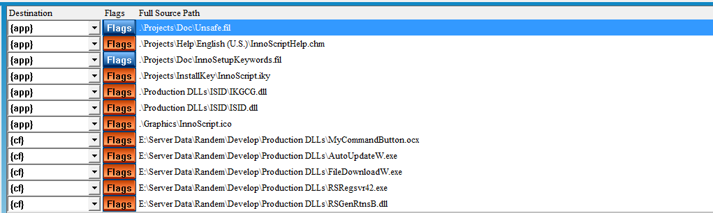 The Add Files tab is used to add any file that InnoScript will not automatically find up such as text, picture, database as well as files InnoScript will find such as dll or ocx files. The reason you may want to add files that InnoScript will automatically find is that when you run InnoScript and InnoScript determines the flags that a file should have included with it, you may want to add additional flags to the file. You can then select the FLAGS button for that file to add the additional flags you want to include in the Inno Setup Script. You can also select where each particular file will be deployed by selecting the destination from the drop down selection on the left. This selection will shot the Inno Setup constants that you can use for deployment. Check the Inno Setup documentation for more clarifications on these constants.