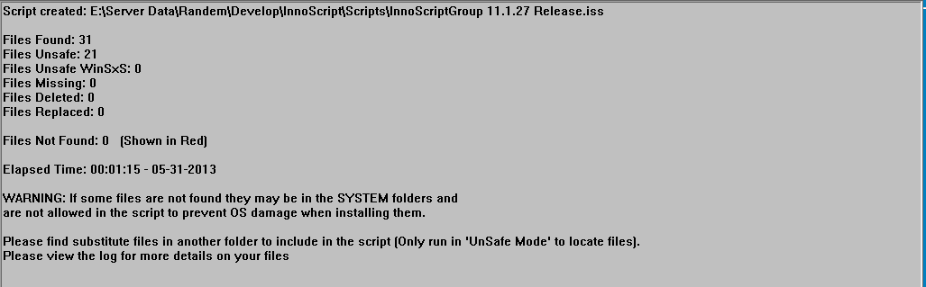 After an InnoScript run; messages about the files used or did not find will be shown as well as the time it took to generate the script.