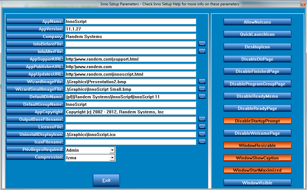 DefaultDirName: DefaultGroupName: AppCopyright: AllowNoIcons: OutputBaseFilename: