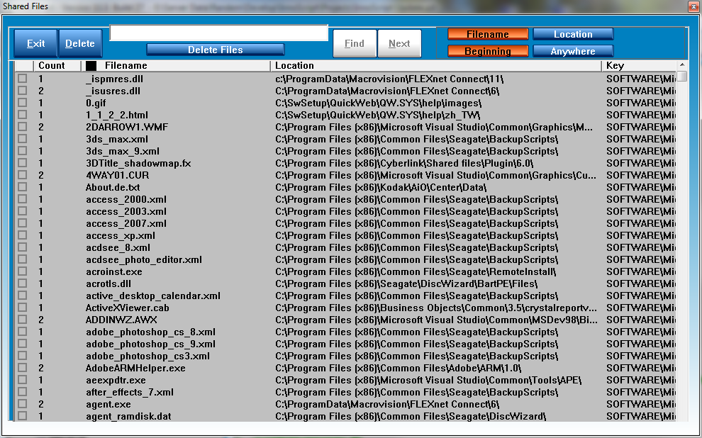 View/Search/Delete items in the registry that are listed as registered shared files. Items in red are entries that have no file at the given location listed in the registry.