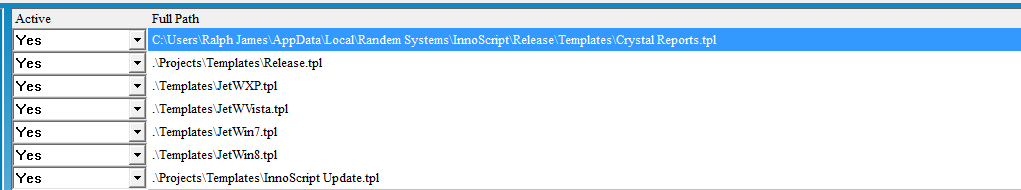 You can use this area to add any lines to your script that you may not be able to add normally in InnoScript. A template script is just a cut down version of a normal script that can contain any lines a normal script can contain. You can add or create a template to hold any code or script line that you may need for several projects, in that way all one would need to do is to add the template to the project and the same code would be there. To the left there is a drop down selection that will allow a template to be marked 'Yes' or 'No', Yes will allow the template to be used and No will keep it from being used.